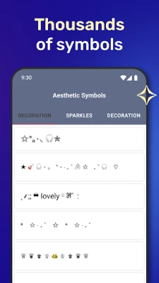 Fedezd fel a Fancy Text Symbols App gazdag gyűjteményét, amely tele van csillogó effektusokkal, elegáns keretekkel és választékos elválasztókkal! Az "Esztétikus Szimbólumok" funkcióval könnyedén hozzáférhetsz egyedi díszítőelemekhez, amelyeket egyszerűen másolhatsz és beilleszthetsz. Alakítsd át a közönséges szöveget rendkívüli alkotássá a "Különleges Szöveggenerátor" segítségével, vagy merülj el az "Esztétikus Hangulatjelek" világában, melyek kifinomult eleganciát kölcsönöznek minden üzenetnek. Sőt, egyedi becenévre vágysz? A "Kreatív Becenév Generátor" egyetlen érintéssel megalkotja a hozzád illő, stílusos azonosítót.