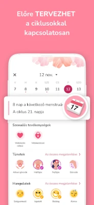A **Period Calendar** diszkrét értesítésekkel emlékeztet a soron következő menstruációra, az ovulációra és a termékeny időszakra, hogy sose maradj le a kulcsfontosságú dátumokról. A felhasználóbarát felület intuitív navigációt kínál, ahol könnyedén áttekintheted a napi bejegyzéseket a vérzésről, együttlétekről, tünetekről, hangulatokról, hőmérsékletről vagy gyógyszerekről. Az alkalmazás különleges, "absztinens" üzemmódja révén az ovulációval és termékenységgel kapcsolatos adatok elrejthetők, így a **Period Calendar** akár fiatalabb lányok számára is ideális naptárrá alakítható. Személyre szabható beállításokkal és számos egyedi funkcióval – mint például a méhnyak vizsgálat nyomon követése vagy a luteális szakasz hosszának állítása – a **Period Calendar** valóban alkalmazkodik hozzád, hogy a legfontosabb információk mindig kéznél legyenek.