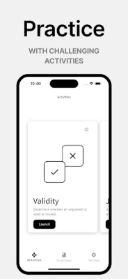 A Symbols Tanulókártyák (Studycards) kiterjedt gyűjteménye a logikai alapelvek, mint például a Modus Ponens, Modus Tollens vagy a Diszjunktív Szillogizmus, világos és szemléletes bemutatásával szolgál, példákkal illusztrálva a könnyebb megértés érdekében. A készségek elmélyítését célzó, lebilincselő Feladatok (Activities) számos kihívást kínálnak. Az „Érvényesség" részben előre megoldott érveket elemezhetsz, ismétléssel erősítve a szabályok felismerését és alkalmazását unalmas monotonitás nélkül. Az „Indoklás" funkció rejtvény-szerű feladatokkal teszi próbára a tudásodat, ahol a hiányzó érvelési lépéseket kell beazonosítanod, ezzel mélyítve a komplex logikai érvek megértését. Végül a „Következtetés" feladatban a "segédkerekek" már lekerülnek, és gyors gondolkodással kell érvényes érveket felépítened, vagy felismerned, ha az nem lehetséges.